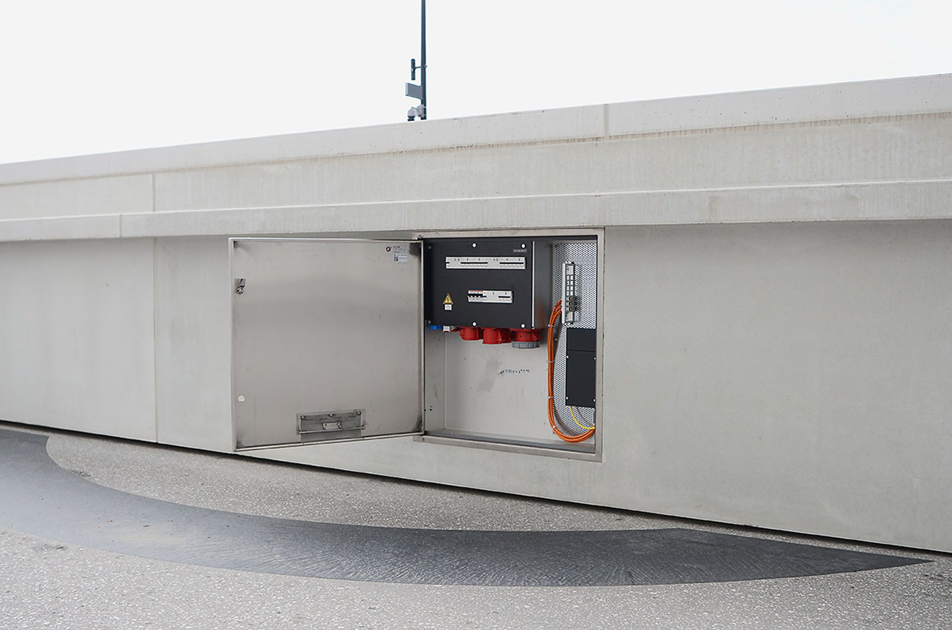 | Bestückung: | unterschiedlich; 230V / 400V Anschlüsse, PowerSAFE 1-polige Hochstrom Steckverbindung, Absicherung, Reserveplätze für bauseitige Einbauten (z.B. Übertragungstechnik) |